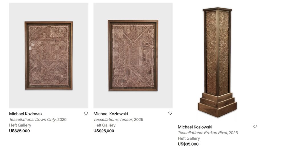 In the everyday sense, algorithms are immaterial; virtual chains of code conceptually inaccessible to the average user, and literally inaccessible to all due to proprietary laws and corporate secrecy. One piece in Zero10, titled Tessellations by Michael Kozlowski, rendered algorithms material, showing the paths of an algorithm’s data through metal-plated resin, replicating an actual digital algorithm.