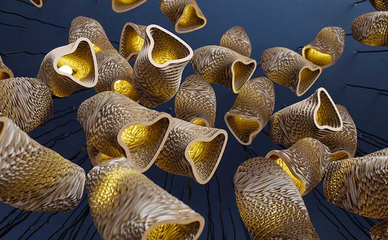 Murmurations debuted as an installation of 500 LED light fixtures with a cardboard shade bottom. The image that led to the light’s design was that of starling flocks flying together, forming a mass of blackness that wheels, turns and swoops in unison. The product also depicts the movement and change one sees while walking around a static object, where the light represents the tipping point of transformation. They will be available with customizable cardboard or glass bases.