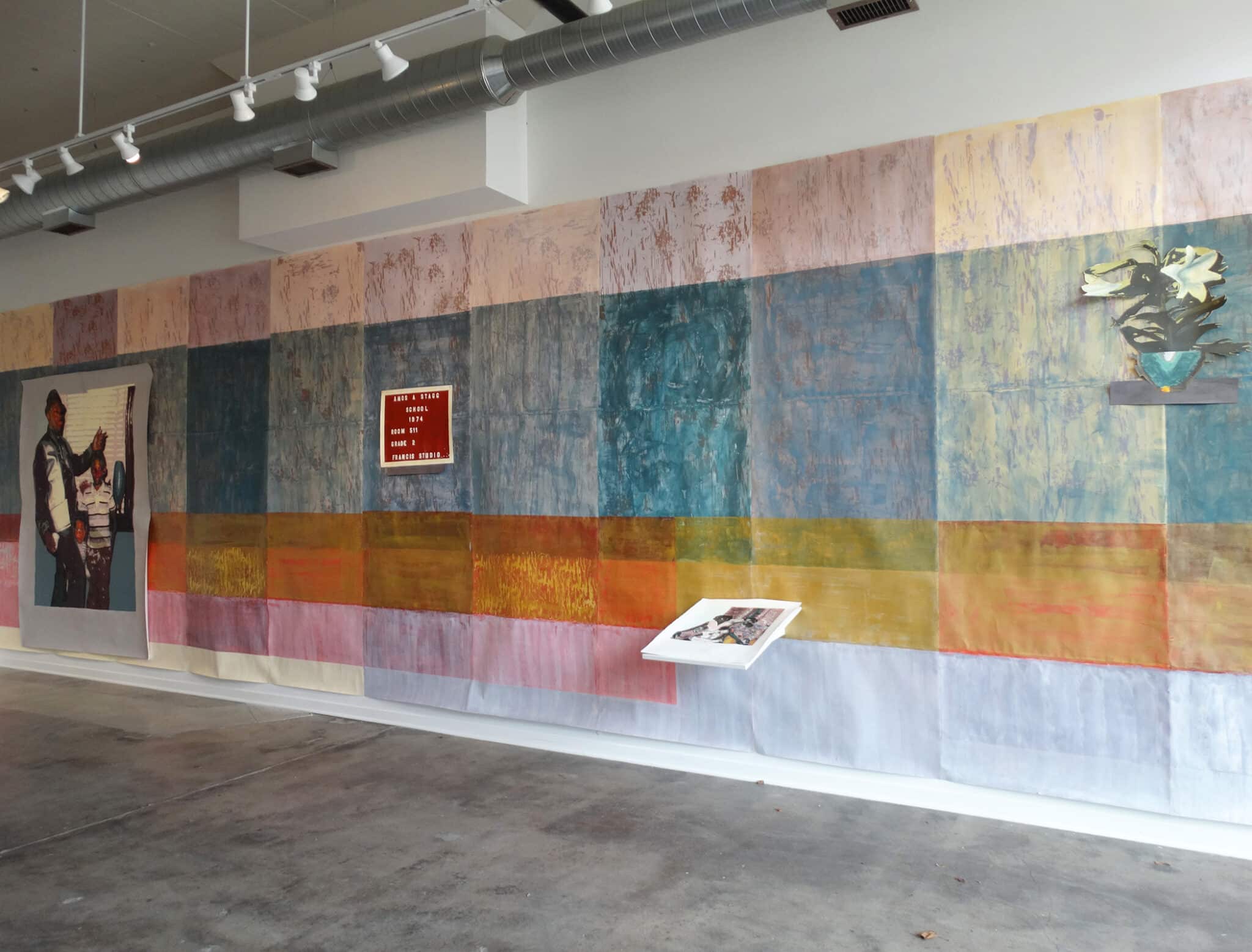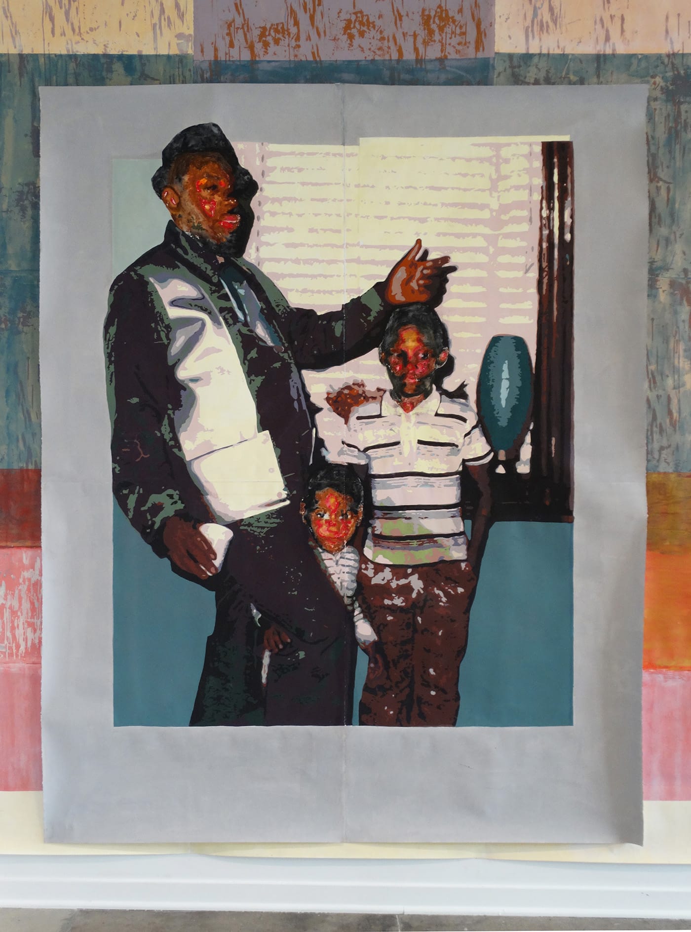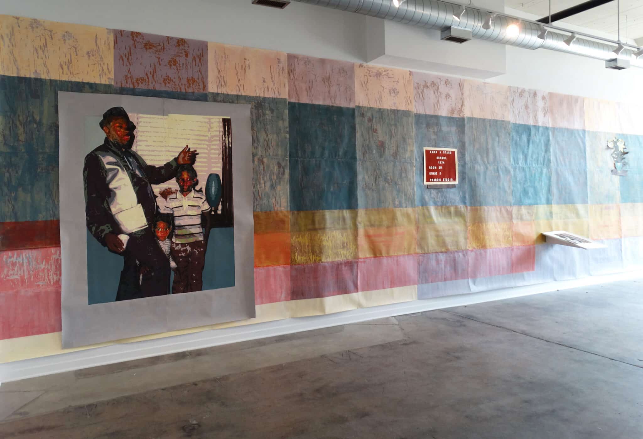 Detroit-based print artist Tyanna Buie creates large works and installations primarily using screen printing and hand-painted water-soluble Caran d’Ache. The base for her life-size prints involves using PhotoShop to magnify found family photographs printed in sections and reassembled. The resulting screen print and Caran d’Ache mix on paper gives her bold, colorful work the airy aesthetic of fabric.
