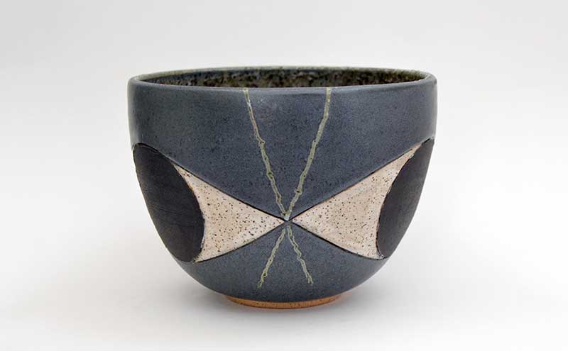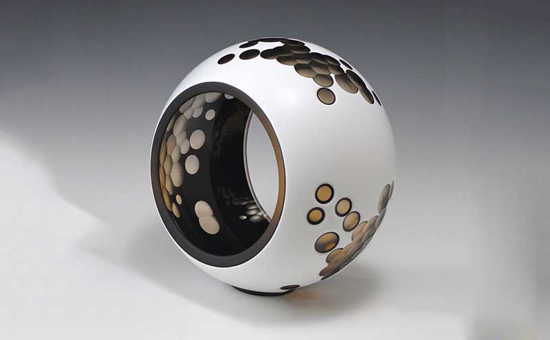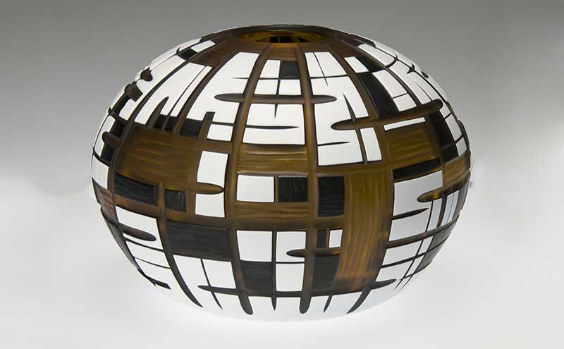 “I create blown glass using Swedish overlay techniques layering colored glass in the walls and on the surface of the glass forms. After the glass has been annealed, I carve the surface of the pieces with diamond wheels to remove layers of glass and expose colors within the piece. Thet blown pieces become the “canvases” on which I design and create,” explained Leonoff in his artist statement for BKLYN DESIGNS.