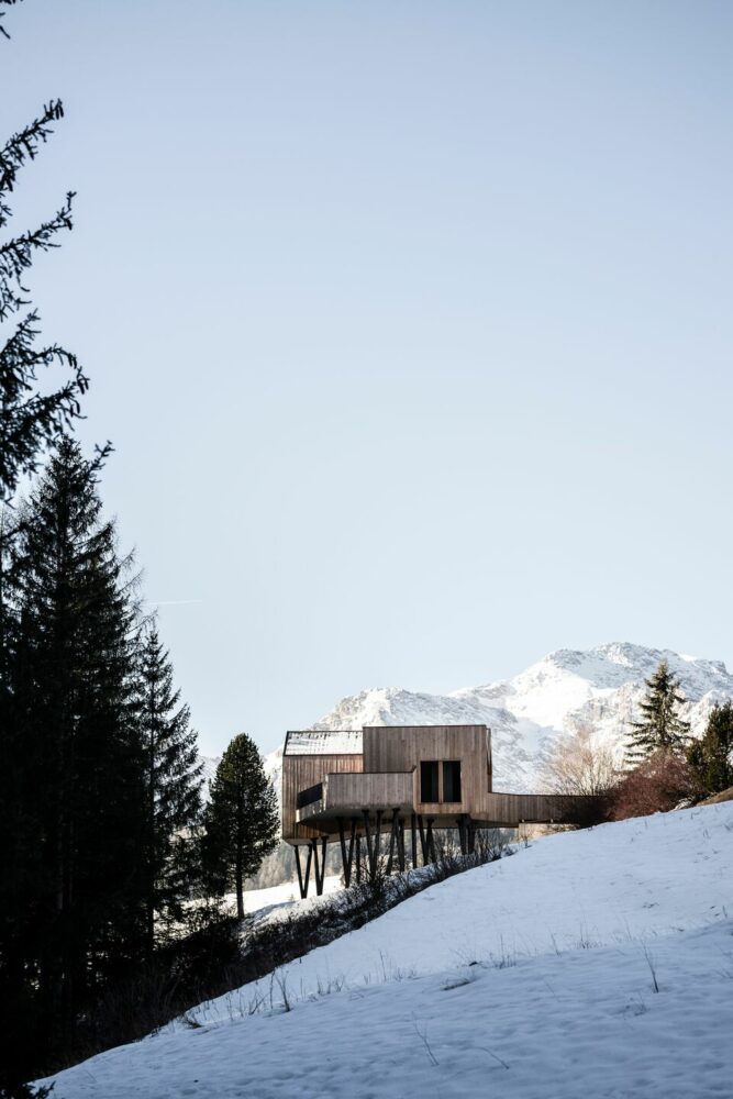 Clever integration with nature is a main feature also in two NOA’s renovation projects. The extension of the Olympic Spa Hotel in Val di Fassa, in the Dolomites region, was completed by the firm in 2023. Their main goal was to integrate the facilities with the surroundings, shifting the center of gravity of the hotel from the provincial road, which most of the rooms hitherto overlooked, to the slope behind it. The new sauna, especially, is an example of “mimetic” design – in NOA’s team words – as well as sustainable intervention.
