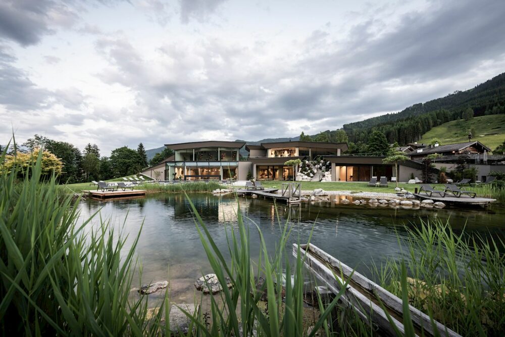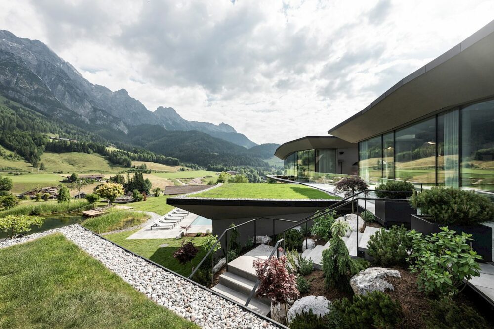 Originally a farmhouse, the Puradies resort, located in Leogang (an Austrian town close to the North of Italy), is now a village of 76 rooms and 14 chalets. Completed in 2023, the renovation focused on the striking mountainous landscape from the very beginning. Now with a new spa and restaurant, Puradies’ floor plans are laid out as concentric rows, blending in with the natural topography. One center faces the bathing lake and the other faces the hill on the South side. The new wellness wing, with its different spaces, rises out of the ground like a gentle wave and disappears again into the meadow with its expressive peaked canopies.