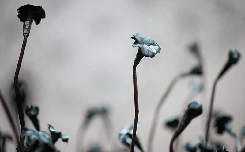 Flowers exhibited in a gallery, all made of steel. You can see, touch and even try to smell them.