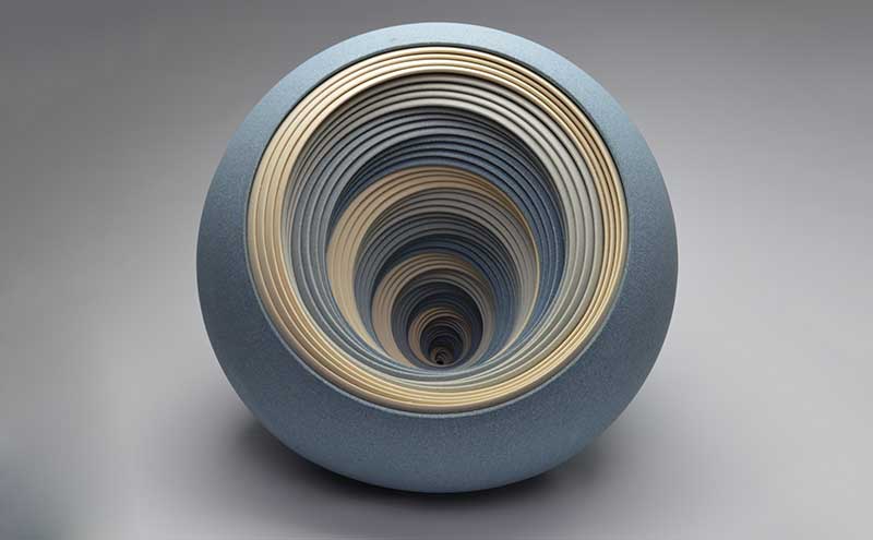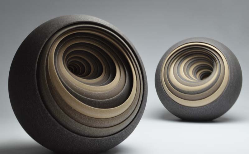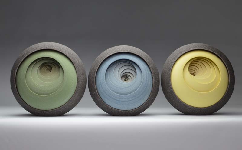 May 2015 rewarded the world of ceramics with artist Matthew Chambers’ latest works at the Puls Ceramics Gallery in Brussels, Belgium. Chambers’ latest exhibition portrayed his UpDown Sequence of ceramic swirls forming spherical objects, a row of his unique Tripartite pieces. Contrasting colors and shades of pastels make up the layers of the Tripartite and show each piece of ceramic art as one of a kind.