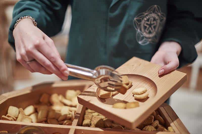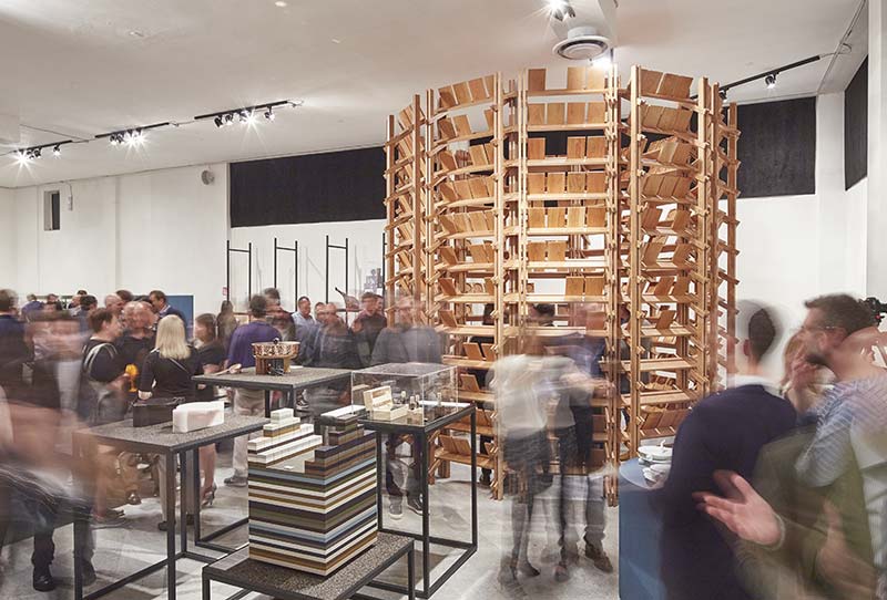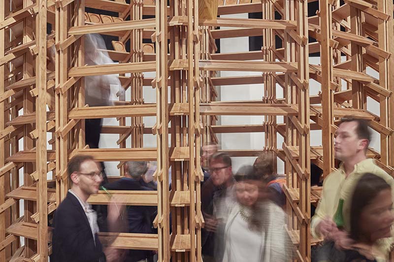 The collaborators were to create a towering structure of food plates, articulating the technical and aesthetic qualities of American cherry. The 3.7-meter-high installation portrayed airy columns of shelves arranged in a cylindrical form with a single ladder that could be slid on the inside from one shelf to the next. Cherry wood snack trays were placed in rows on each shelf and visitors could take one home as limited-edition samples from the exhibition. Not one of the 526 trays were left behind. ArchiExpo’s team may have taken the last one.