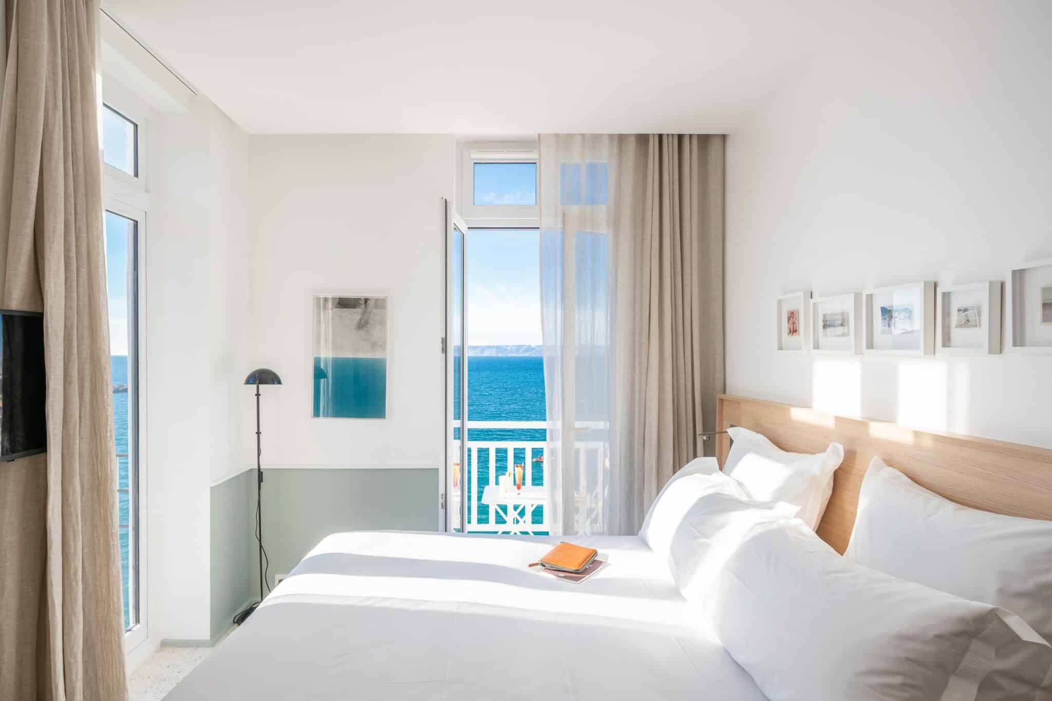 The 19 rooms, all with terraces or balconies, are all dream watchtowers to admire the sailboats that sail around the Frioul islands. A rooftop bar occupies the space above the restaurant and a new pool sits on the roof for hotel guests or private parties. The restaurant gives pride of place to the Mediterranean cuisine and where the rosé comes from the vines of Lourmarin.