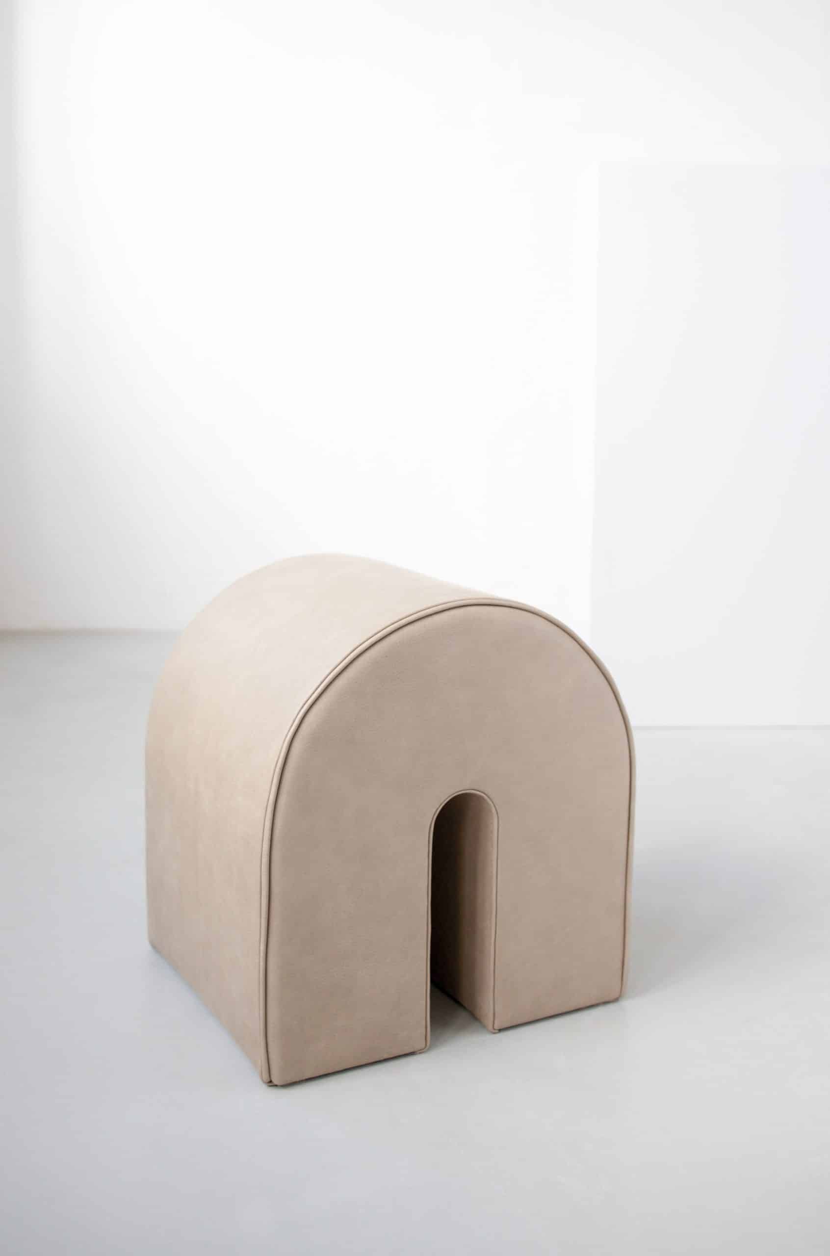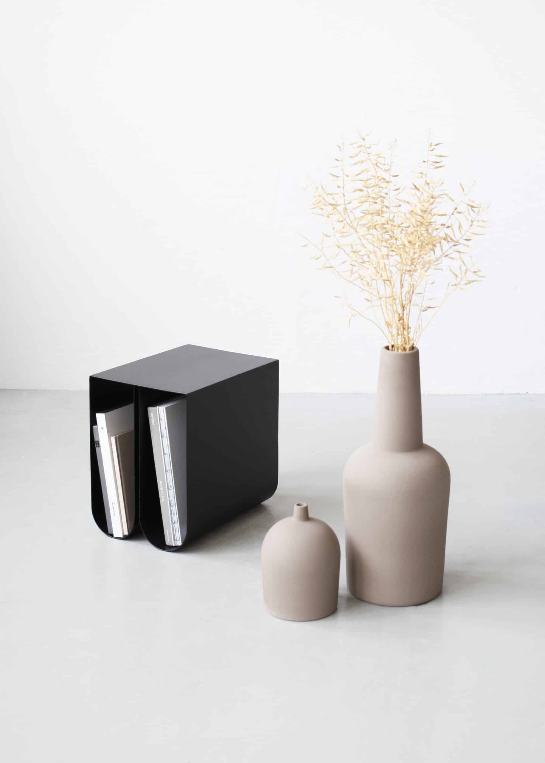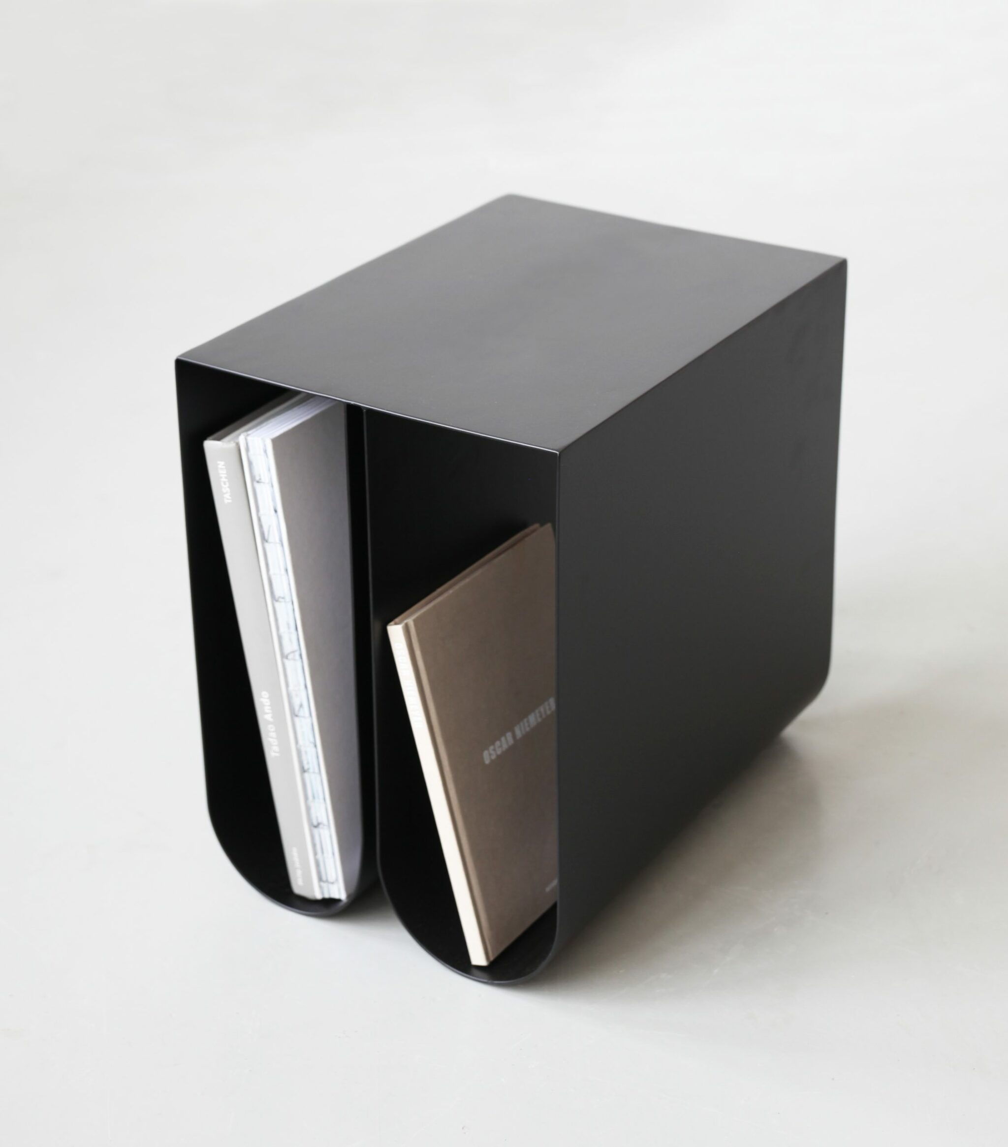 Danish designer Kristina Dam brought several new Nordic minimalist pieces to Maison & Objet including the Curve poof and side table. The poof is a simple inverted U shape covered in a natural tone leather with a medium-density fiberboard frame. The low black metal side table continues the theme with two U shaped metal magazine holders as its base.