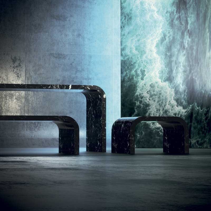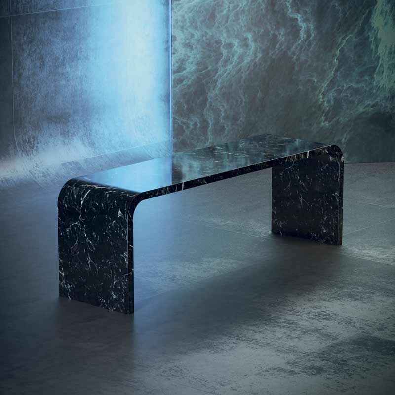Iosa Ghini:The story of this project is very simple. I knew these people that work with marbles and stones [MGM] because I use a lot of stones and marble in my projects for interiors, mostly in Moscow and New York, but other places too. I had some ideas while designing the atrium of hotels and condominiums. My channel is the curve. I have a curved channel. It’s not straight. When I start to design something, I think about the different ways of working around this kind of material. You can cut straight through marble, but with my curved channel I think of how I can use curves: convex or concave. You can sculpt blocks of marble, too.