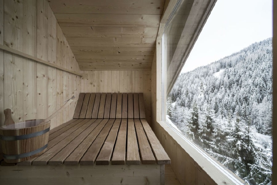 Continuing their efforts to fuse comfort with the Alta Badia mountain atmosphere, the new penthouse is made up of three suites, a large lounge with a fireplace, bar, kitchen area and glass panel windows that allow the exterior to become part of the interior. In keeping with the level of luxury, the penthouse also includes a special touch: a wellness area that peers out over the mountain landscape, allowing a direct physical connection to the environment.