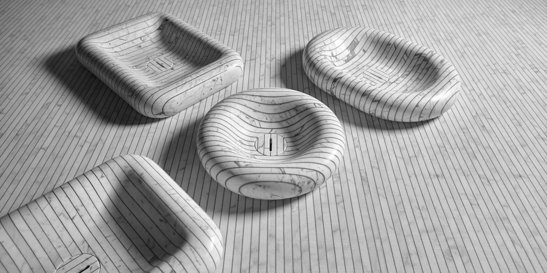The 024 is made entirely of recovered marble. To further lessen the environmental impact, only portions of marble recovered from other processes are used and not whole blocks. Twenty-four wedges of marble are glued together by epoxy resin in contrasting colors.