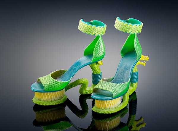 - Extreme Serpent Shoes 3D design by Dr. Michaella Janse van Vuuren Stratasys – Model Lerato Moloi – Photo by Merwelene van der Merwe studio.