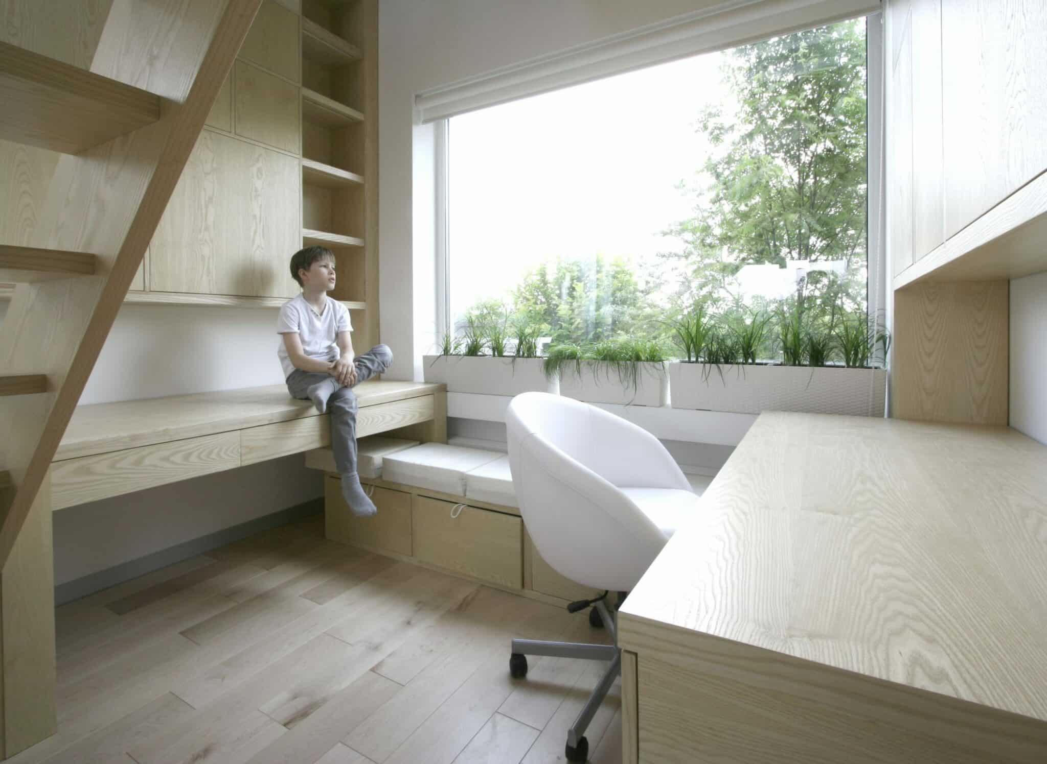 The architect couple chose Canadian Maple for the parquet flooring. The interior walls and ceilings are plastered and painted white, offering a bright ambiance; while the furniture and all other elements including the staircase and their transformer furniture piece, the black cube, are made of veneered MDF (Medium Density Fiberboard). The black cube has four parts that can be shifted and rolled in different ways, to convert from a closed sleeping space to various seating arrangements.